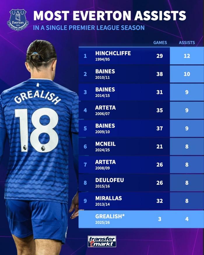 • 格拉利什 在 2025/26 赛季,出场 3 次,已贡献了 4 次助攻